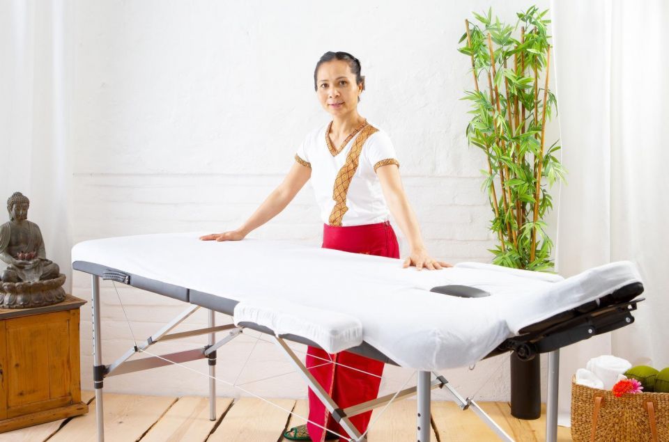 Die Thaimassage selbst findet traditionell auf einer dünnen Matratze am Boden statt. Eine geeignete Behandlungsunterlage kann Ihre Therapeutin falls nötig zur Massage mitnehmen. Bitte sorgen Sie für ausreichend Platz auf dem Boden (ca. 2,50m x 1,50 m).